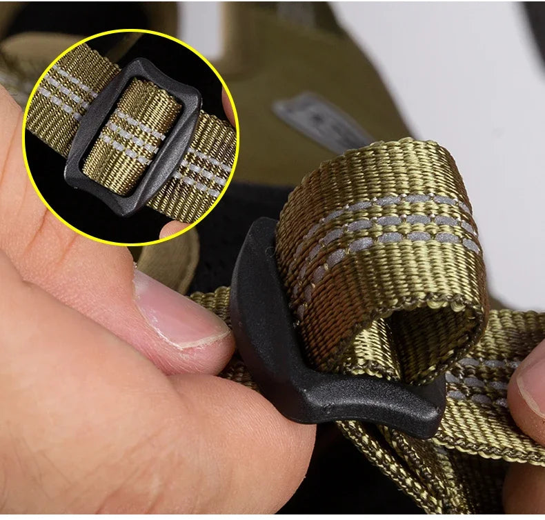 ⚙️ Ferragens Premium – Equipado com fivelas Duraflex , argola em D em aço inoxidável e fita em nylon reforçada com detalhes refletores para maior resistência.