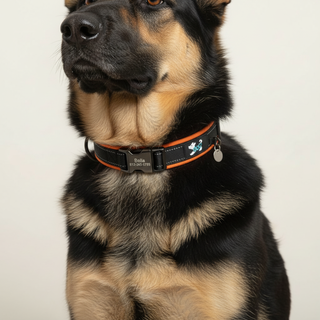 🔖 Placa de identificação personalizada gravada – Adicione o nome e o número de telefone do seu cão para uma identificação rápida.
