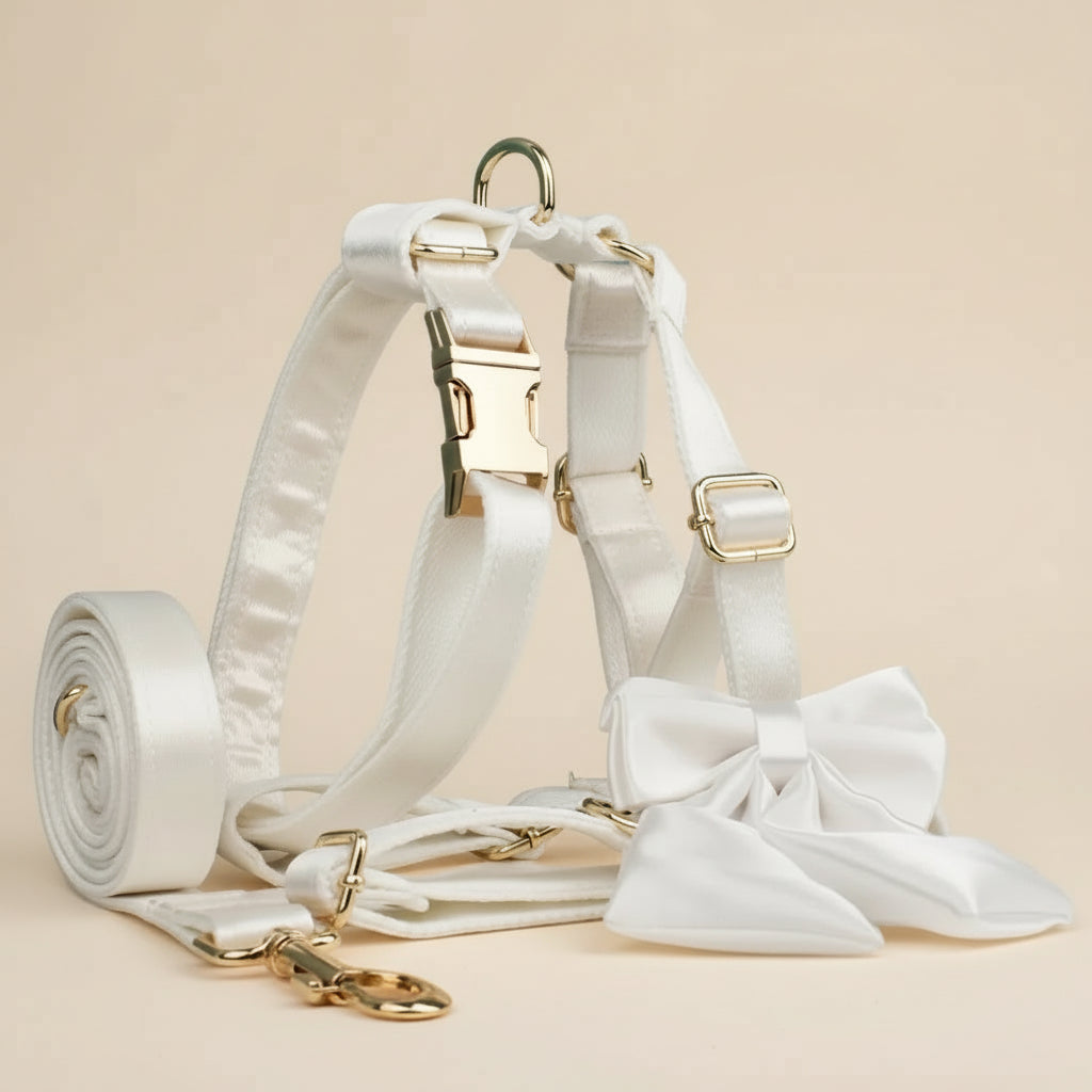 - Conjunto completo: Inclui coleira, trela, peitoral e laço a condizer para um estilo coordenado.
