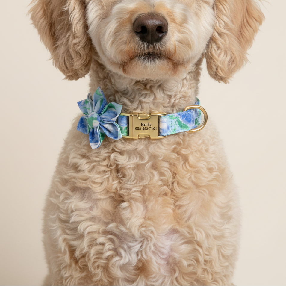 Chiques, confortáveis e personalizadas. Estas coleiras têm uma fivela gravada com o nome do seu cão e suas informações de contato — sem necessidade de etiquetas, apenas estilo e segurança, tudo em um.