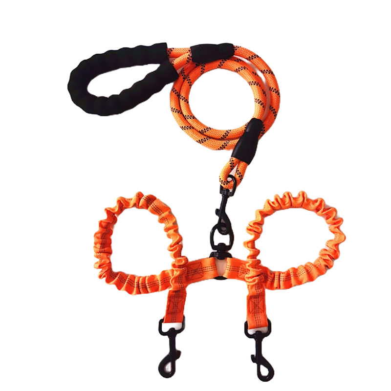 Passear com dois cães torna-se mais fácil, seguro e confortável com o acoplador de trela elástica dupla para cães . Concebido com uma trela resistente para escalada e uma extensão elástica dupla com absorção de impactos, este acoplador reduz a tração, minimiza o esforço e dá a cada cão espaço suficiente para se movimentar livremente.
