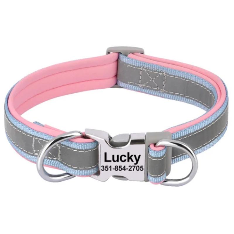 Feita com nylon premium, resistente e leve, esta coleira possui costuras refletivas para melhor visibilidade durante caminhadas noturnas. O interior é acolchoado para maior conforto, tornando-a ideal para o uso diário. O design ajustável se adapta a cães de pequeno a grande porte, incluindo raças como Pugs, Retrievers e outras.