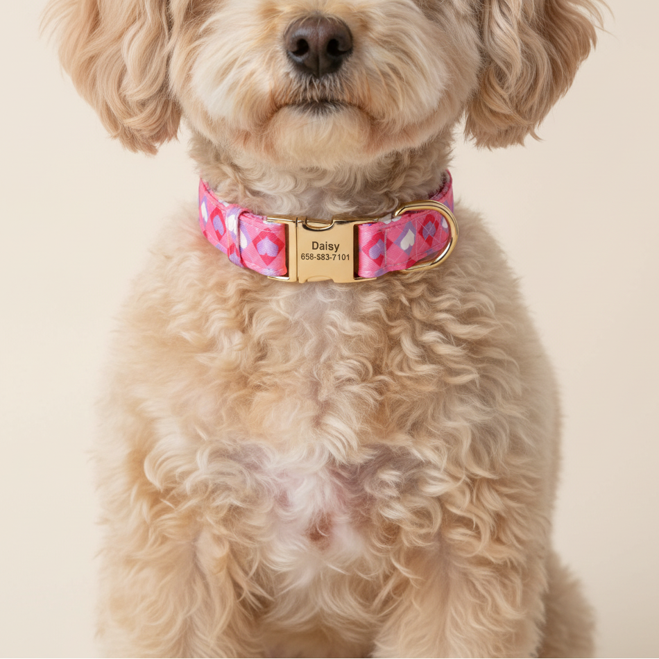 Chiques, confortáveis e personalizadas. Estas coleiras têm uma fivela gravada com o nome do seu cão e suas informações de contato — sem necessidade de etiquetas, apenas estilo e segurança, tudo em um.