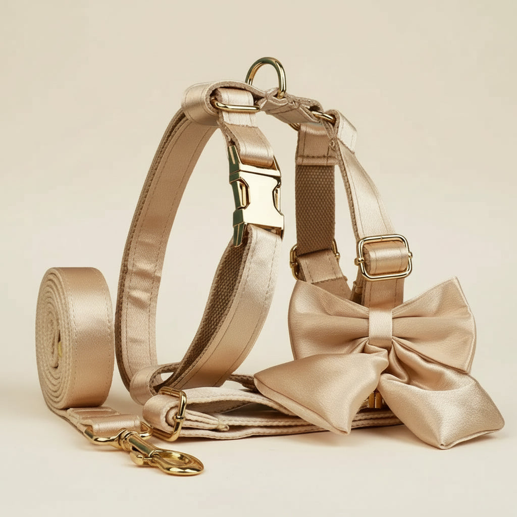 - Conjunto completo: Inclui coleira, trela, peitoral e laço a condizer para um estilo coordenado.
