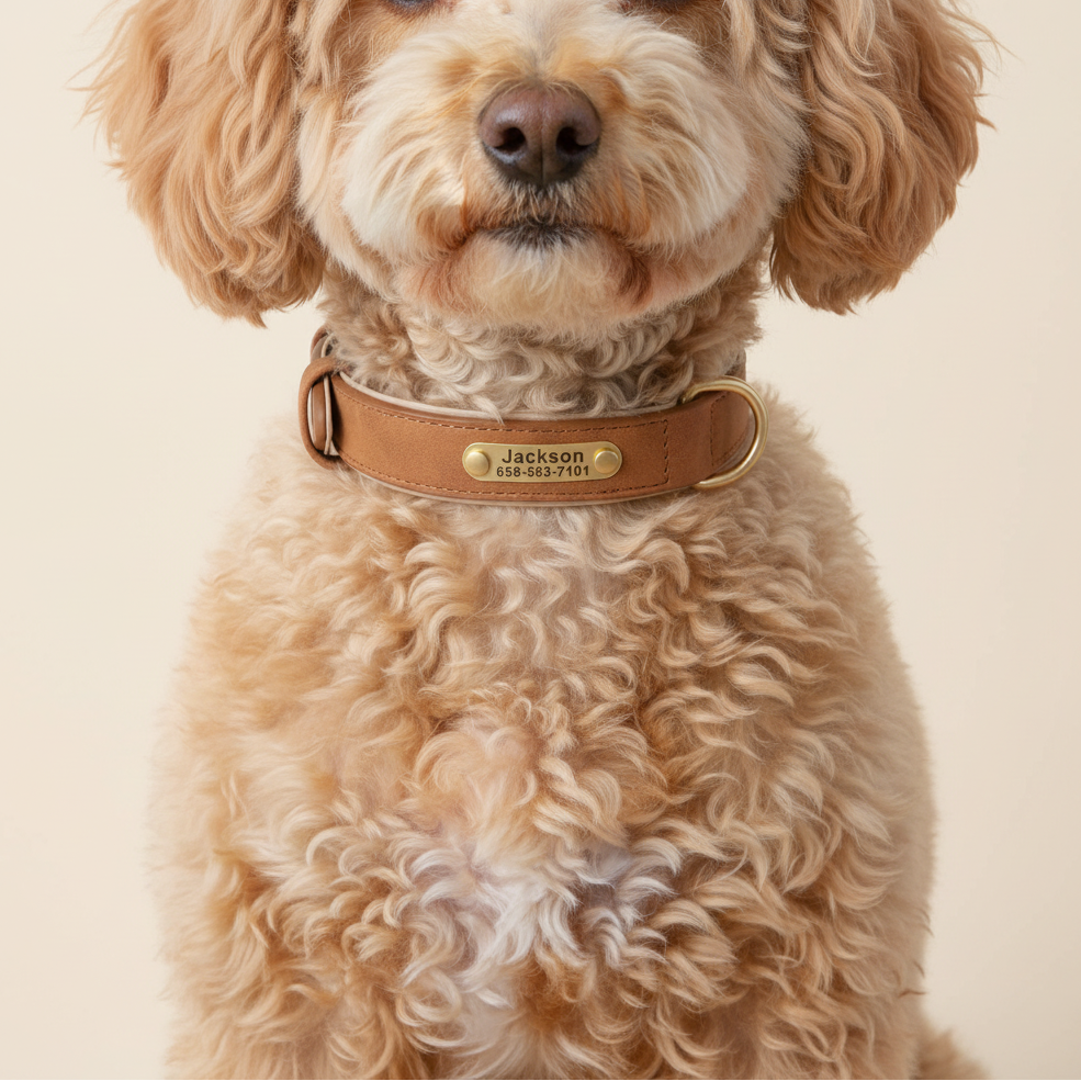 Chiques, confortáveis e personalizadas. Estas coleiras têm uma fivela gravada com o nome do seu cão e suas informações de contato — sem necessidade de etiquetas, apenas estilo e segurança, tudo em um.