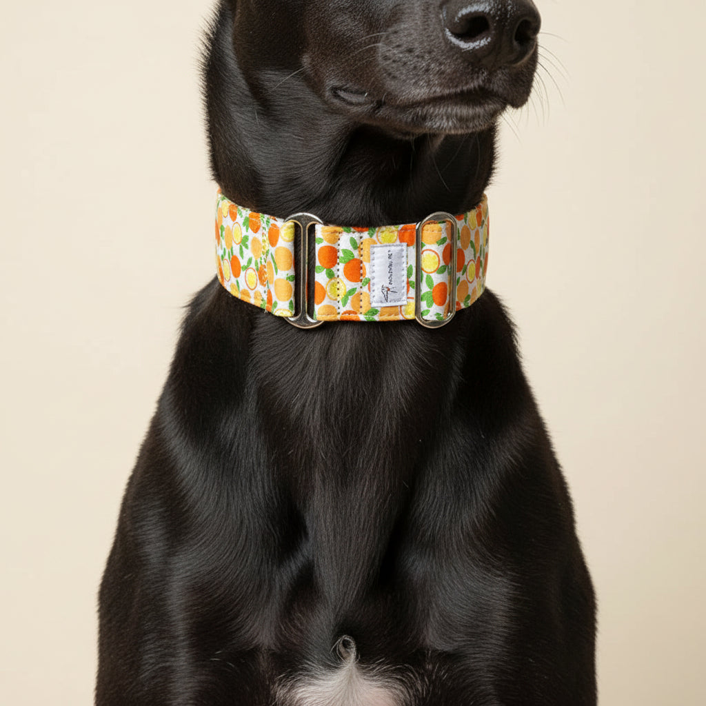 Feito de tecido 100% algodão com forro durável. Escolha entre um modelo martingale slip-on para um controle suave ou uma fivela lateral clássica com ajuste ajustável e argola em D de metal. Limpe com água e sabão neutro; deixe secar na horizontal. Não lavável na máquina.